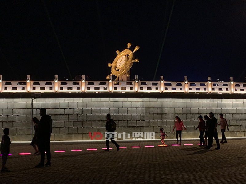 除此之外,在太陽(yáng)島東西兩側(cè)廣場(chǎng)還安裝了特色互動(dòng)燈具,包括互動(dòng)鋼琴、互動(dòng)投影游戲、互動(dòng)圓形地磚燈等,游客可與燈光互動(dòng),感受燈光、享受科技與藝術(shù)融合帶來(lái)的視覺(jué)享受和體驗(yàn)。